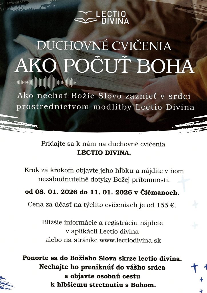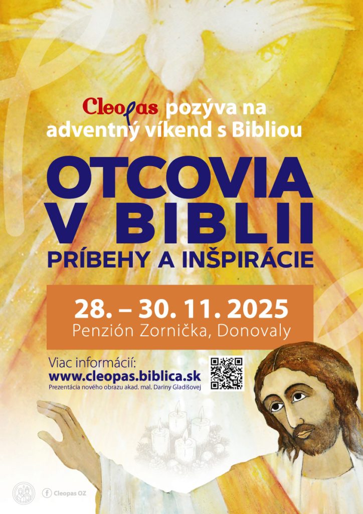 Cleopas, o. z., v spolupráci s Rímskokatolíckou cyrilometodskou bohosloveckou fakultou Univerzity Komenského v Bratislave (RKCMBF UK), vás pozývajú na adventný víkend s Bibliou s názvom Otcovia v Biblii – príbehy a inšpirácie, ktorý sa bude konať v dňoch 28. – 30. novembra 2025 v penzióne Zornička na Donovaloch, v náručí Nízkych Tatier (https://penzionzornicka.sk/). Pôjde o biblicko-duchovné sústredenie, v ktorom budú prednášky spojené so spoločnou modlitbou. Svojimi prednáškami nás obohatia biblisti a prednášajúci nielen na RKCMBF UK prof. Pavol Farkaš, PhD., doc. Ing. Jozef Jančovič, S.S.D. Ing. Martina Korytiaková, doc. SSD Blažej Štrba, ale aj doc. Branislav Kľuska, PhD. (PedF KU), ThDr. Ľubomír Majtán, ThDr. Ing. Anton Solčiansky, PhD. a ThDr. S.S.Lic. Jozef Tiňo (TF TU). Sprievodným slovom nás bude sprevádzať generálny vikár Žilinskej diecézy CSIDr. ThLic. Martin Kramara.